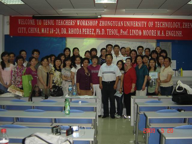 为促进公司教师与国外大学教师的交流,引进先进的教学理念和方法,公司特邀美国专家和菲律宾博士组成的亚太跨文化代表团(Asia-Pacific Cross Cultural Institute )到外语系进行学术交流。公司副经理杜建慧、外办主任孙玮、外语系副主任郭万群、张智中接待了访问团,并对今后的进一步合作进行了商讨。 5月18日至21日晚上,美国专家(Mrs. Linda F. Moore, Director of APCCI)和菲律宾博士(Dr. Rhoda Perez)为外语系教师进行团队培训,参加培训的教师还有河南工业大学和河南教育学院的教师代表、在河南工作的菲律宾教师。Dr. Rhoda Perez就语言学、教学法、英美语音的对比和课堂如何与员工互动进行详细的阐述,并让外语系教师代表、工大教师代表、菲律宾教师代表讲示范课,在座各位教师进行讨论、点评。通过培训我系共有60名教师被授予国际通用英语教学证书TESOL(Teaching English to Speakers of Other Languages)。 在访问期间,代表团还三次参与课堂教学,向同学们介绍美国的教育体制、老员工活和学习英语的方法,对同学们关心的话题一一解答,并对主动回答问题的同学赠送纪念徽章。外专们幽默的语言,丰富的表情使课堂气氛非常活跃。
