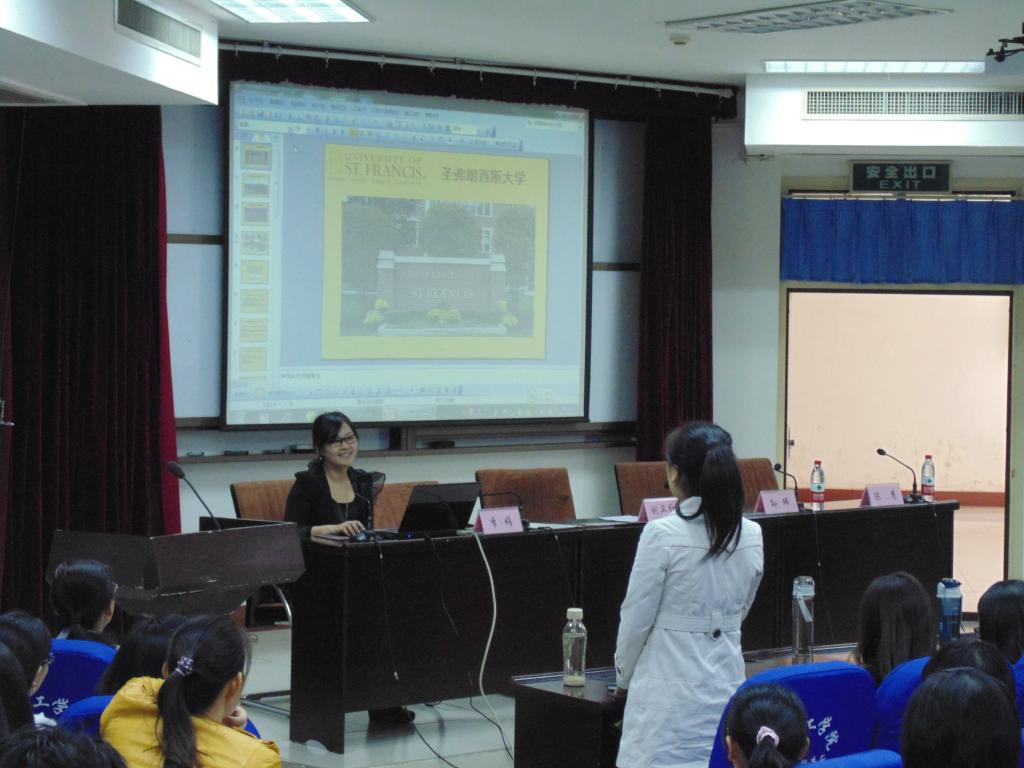 李娟老师首先播放了一段视频,视频记录了十几位来自世界各地的员工在圣弗朗西斯大学学习生活的感想。观看视频后,一位在座员工表达了自己对圣弗朗西斯大学优美的环境和活泼的课堂气氛的向往。