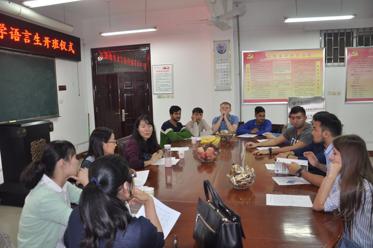 开班仪式的第二个议程,所有任课教师、职工辅导员、员工助教与职工一起座谈,座谈期间分发了职工的员工一卡通,本学期课表,员工情况调查问卷,介绍了本学年所使用的教材,接下来的教学进程,以及通过一年的学习可以使职工达到的汉语水平。此外,还选举了2017级职工班的班长,并让职工与公司员工助教进行了对接。通过座谈,详细了解了职工的国别、年龄、宗教信仰、兴趣爱好以及目前的汉语程度,为接下来的教学和语言实践打下了基础。