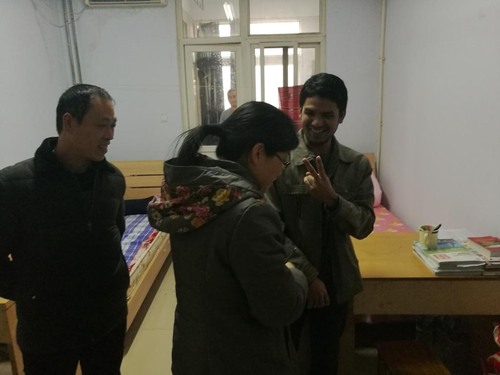1月7日上午,外语学院副书记周全营,大外二部主任闫秋霞,汉语系教师彭琰,辅导员葛士阳共同到南5宿舍楼,按照宿舍分布名单四位老师对来华语言职工进行了走访。每进一间宿舍老师们都详细的查看宿舍取暖、用电情况并了解课余时间学习情况。看到老师来到宿舍,员工们主动向老师打招呼,部分员工还较为熟练的用汉语进行交流。得知绝大多数员工将在中国度过假期,老师们友善提醒大家宿舍将停止供暖,宿舍楼也将定时开放门禁,要做好准备。同时,询问了在生活学习上有什么问题老师可以协助解决。为了尽可能掌握留校员工假期去向,老师们进行了摸底并做了记录,提醒他们出行一定要注意安全。除此之外,还查看了学校提供给职工集中做饭的自主厨房,公用洗浴间等。整个走访过程持续了一个多小时,涵盖了所有宿舍。