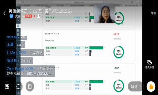 第三,针对使用单一线上教学平台,及其单一功能容易产生的线上教学互动效果不佳的问题,经过英语系全体老师的集体讨论和经验总结,建议老师们多掌握几个线上教学平台的使用方法,充分挖掘每个平台的最优势资源,将其纳入到线上教学课堂当中。英语系老师线上教学多采用多平台优化组合方式,互动效果明显加强。