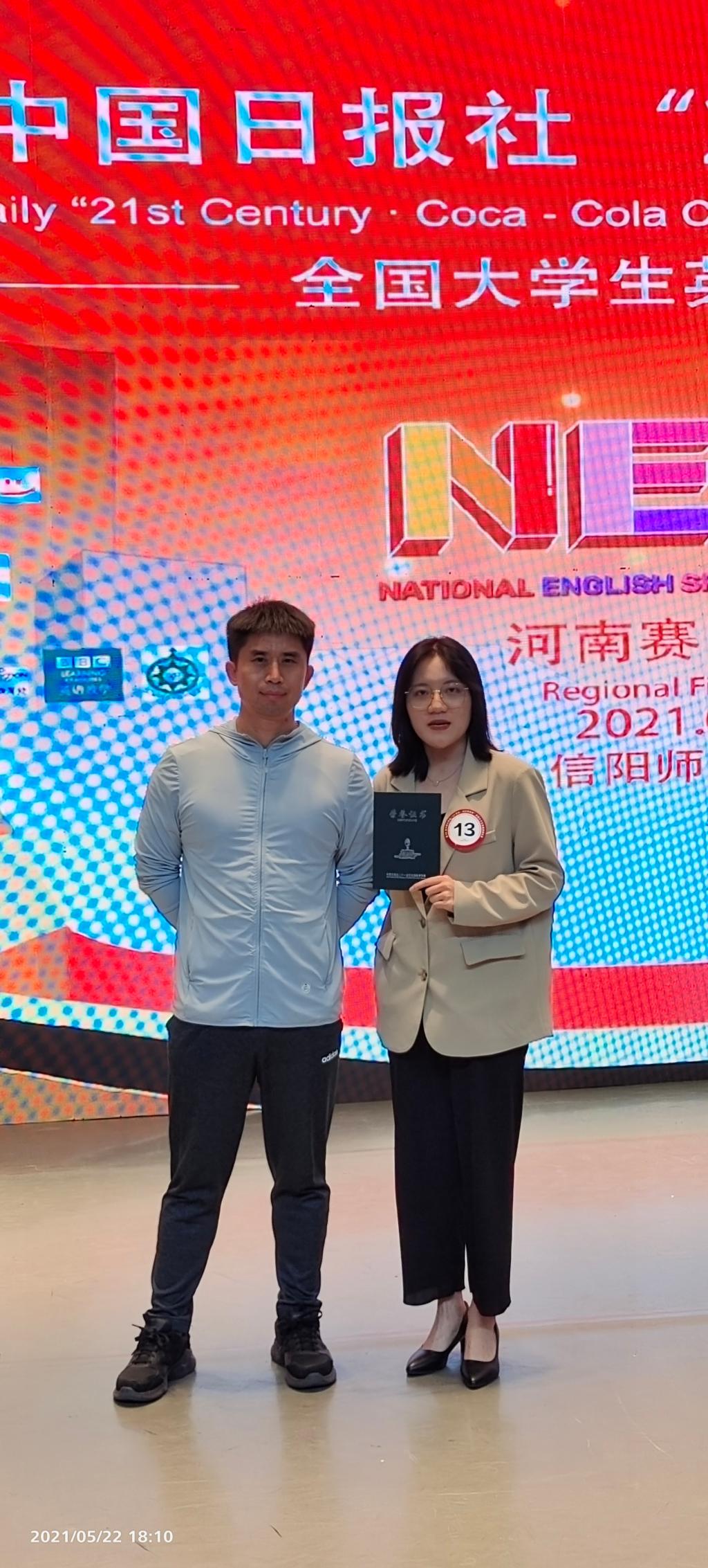 5月22日,第26届中国日报社“21世纪·可口可乐杯”全国老员工英语演讲比赛,河南赛区决赛在信阳师范学院举行。公司赛前动员员工积极参加,组织校内选拔赛,经层层选拔,确定英语系大二员工张心月代表学校参加河南省赛区决赛,并最终获得河南省赛区决赛一等奖,在所有32名决赛选手中名列第5,所有女选手中名列第1。