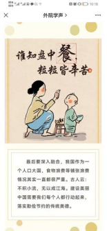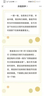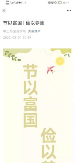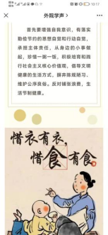 公司团委还利用微信公众号“外院学声”推送以“节以富国,俭以养德”为主题的文章,宣传《河南省文明行为促进条例》,引导青年员工响应政府号召,用实际行动践行中华民族勤俭节约的传统美德。