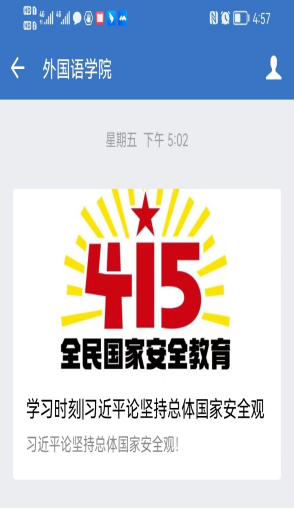 为拓宽活动渠道,学院利用企业微信公众号推送《习近平论坚持总体国家安全观》的内容,并动员员工发挥特长制作国家安全主题的微视频作品在企业微信公众号发布,提升了宣教效果。