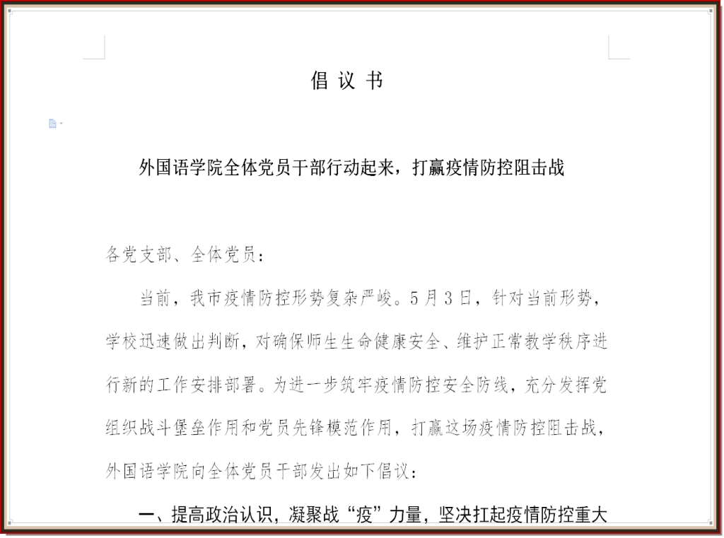 当前,我市疫情防控形势复杂严峻,为迅速落实公司党委疫情防控工作部署,进一步筑牢疫情防控安全防线,充分发挥党组织战斗堡垒作用和党员先锋模范作用,近日,公司党委向学院全体党员干部发出倡议书,号召大家行动起来,打赢这场疫情防控阻击战。