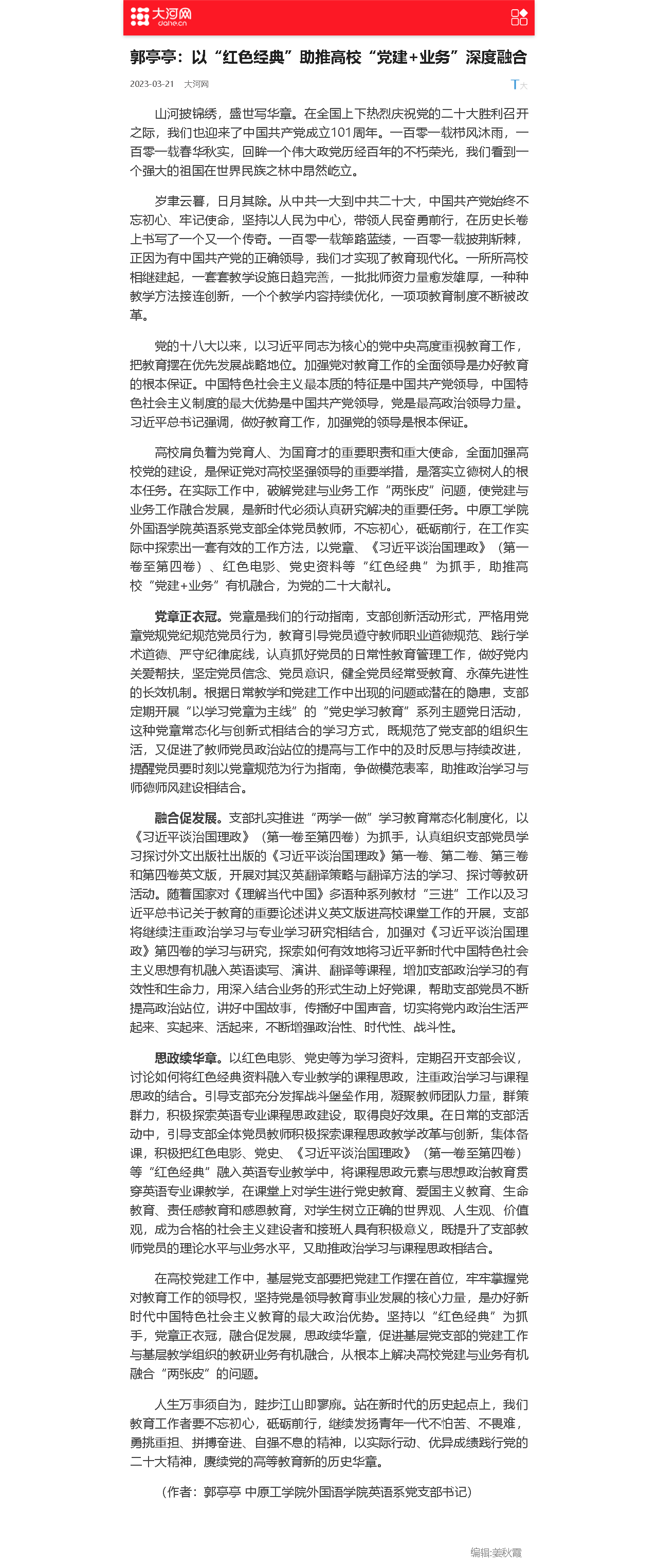 思政续华章。以红色电影、党史等为学习资料,定期召开支部会议,讨论如何将红色经典资料融入专业教学的课程思政,注重政治学习与课程思政的结合。引导支部充分发挥战斗堡垒作用,凝聚教师团队力量,群策群力,积极探索英语专业课程思政建设,取得良好效果。在日常的支部活动中,引导支部全体党员教师积极探索课程思政教学改革与创新,集体备课,积极把红色电影、党史、《习近平谈治国理政》第一卷至第四卷等“红色经典”融入英语专业教学中,将课程思政元素与思想政治教育贯穿英语专业课教学,在课堂上对员工进行党史教育、爱国主义教育、生命教育、责任感教育和感恩教育,对员工树立正确的世界观、人生观、价值观,成为合格的社会主义建设者和接班人具有积极意义,既提升了支部教师党员的理论水平与业务水平,又助推政治学习与课程思政相结合。