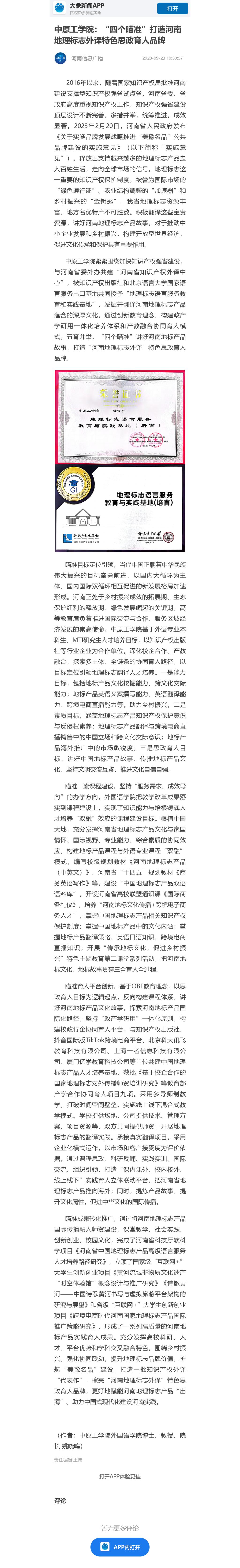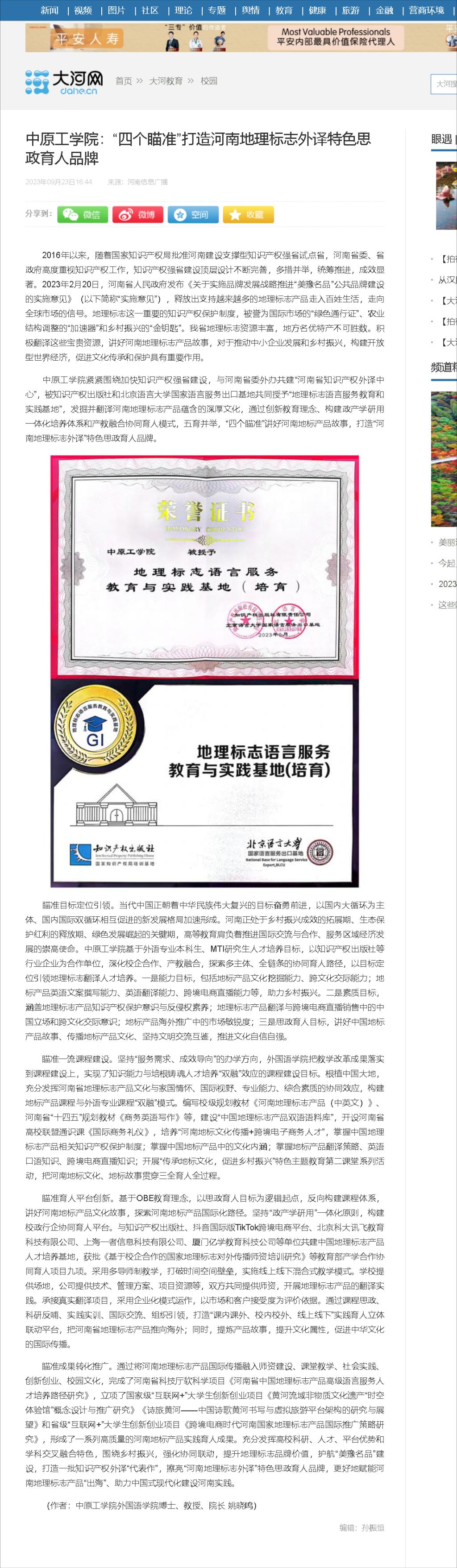 威廉希尔紧紧围绕加快知识产权强省建设,与河南省委外办共建“河南省知识产权外译中心”,被知识产权出版社和北京语言大学国家语言服务出口基地共同授予“地理标志语言服务教育和实践基地”,发掘并翻译河南地理标志产品蕴含的深厚文化,通过创新教育理念、构建政产学研用一体化培养体系和产教融合协同育人模式,五育并举,“四个瞄准”讲好河南地标产品故事,打造“河南地理标志外译”特色思政育人品牌。