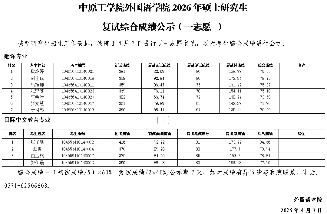 2026年硕士研究生 复试综合成绩公示(一志愿 )